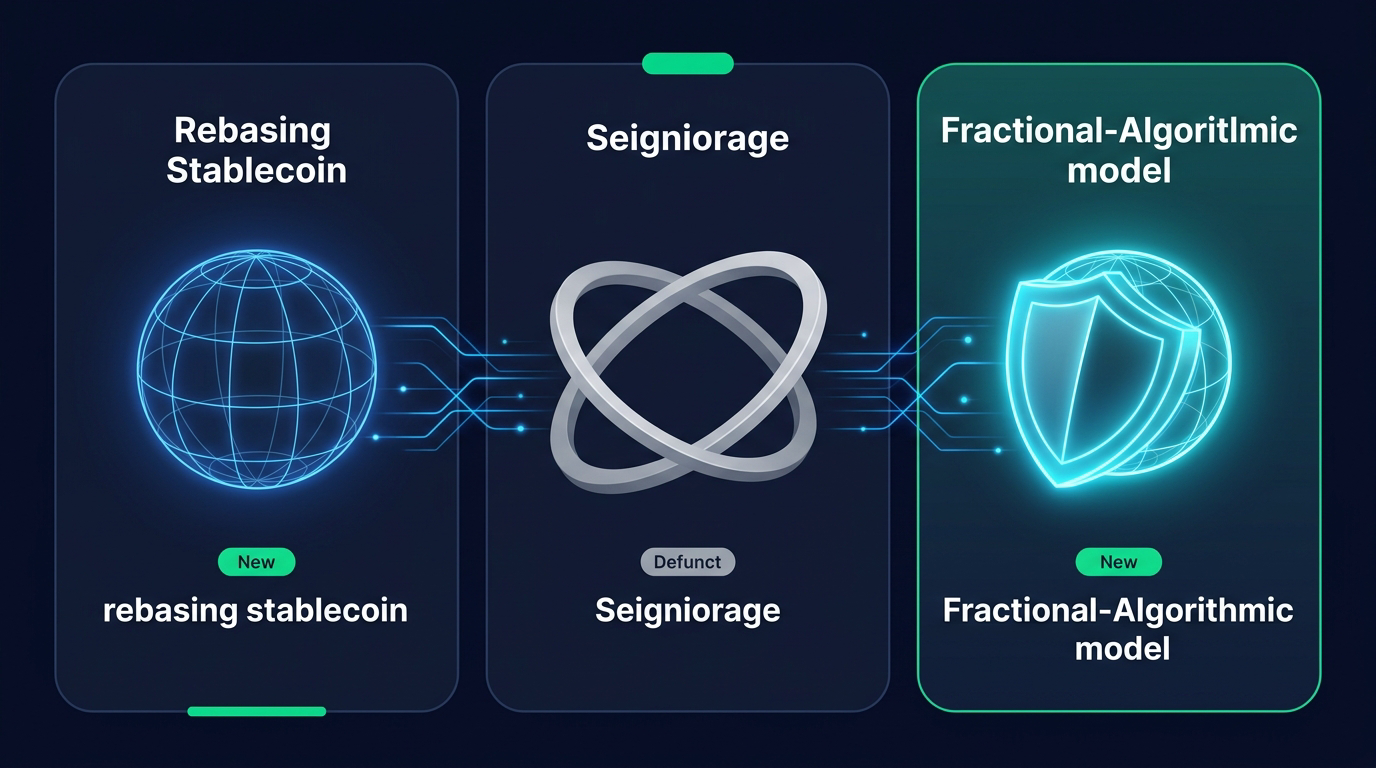 Three core model types have emerged. Rebasing stablecoins (like Ampleforth/AMPL) automatically adjust token balances in every holder's wallet to target $1 - if the price is high, your balance increases; if low, it decreases. Seigniorage stablecoins (like the now-defunct TerraUSD) use a dual-token system where a companion token absorbs volatility. Fractional-algorithmic stablecoins (like Frax Finance/FRAX) combine partial hard collateral with algorithmic supply management. In 2026, fractional-algorithmic designs dominate the surviving landscape, as pure models without hard collateral floors were largely discredited by the 2022 Terra collapse.