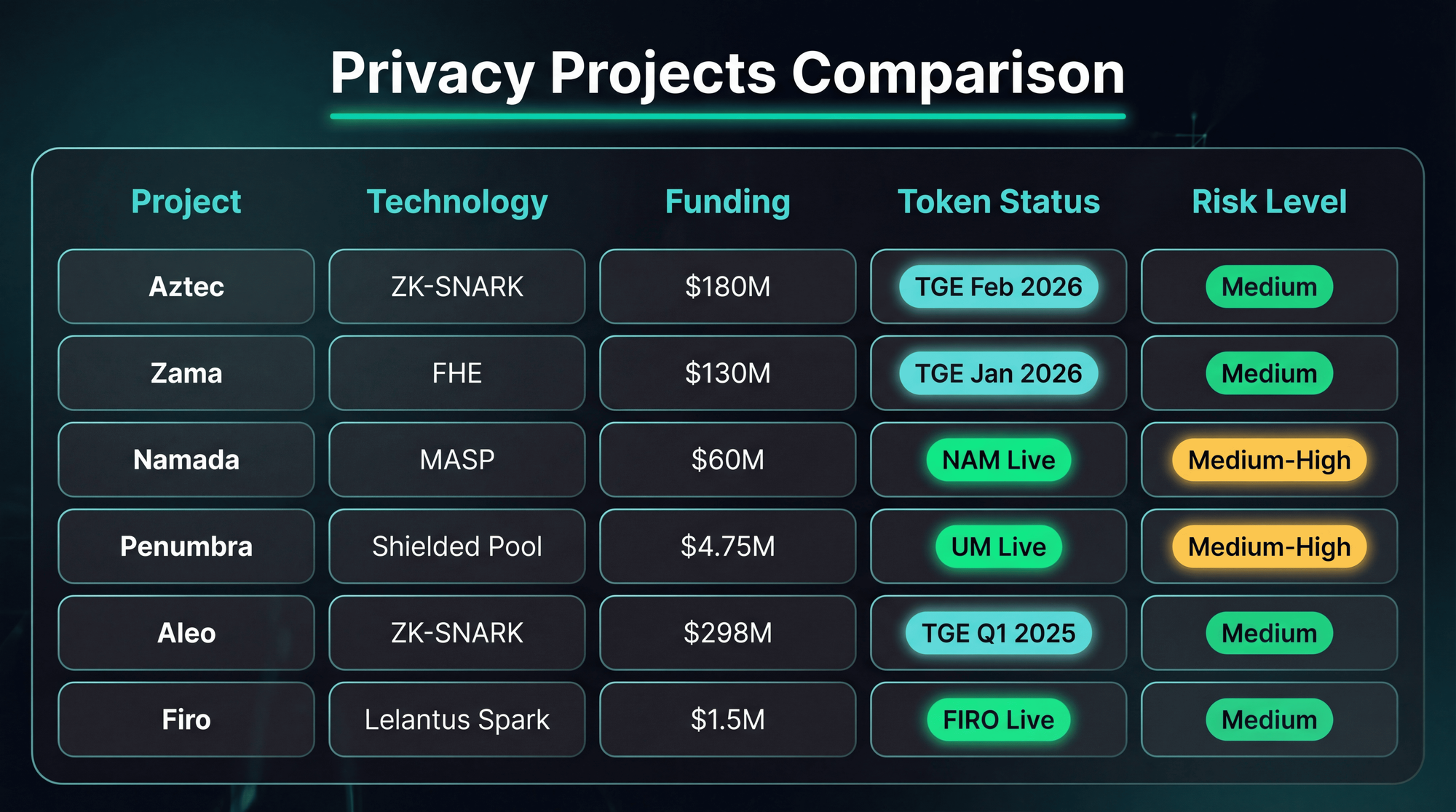 Aztec Network stands out with $180M in total funding, mainnet launch on Ethereum (November 2025), and TGE scheduled for February 2026. For FHE technology, Zama's $1B+ valuation and January 2026 TGE make it the leader. For established exposure, Monero's $8.5B market cap and January 2026 ATH demonstrate proven demand.