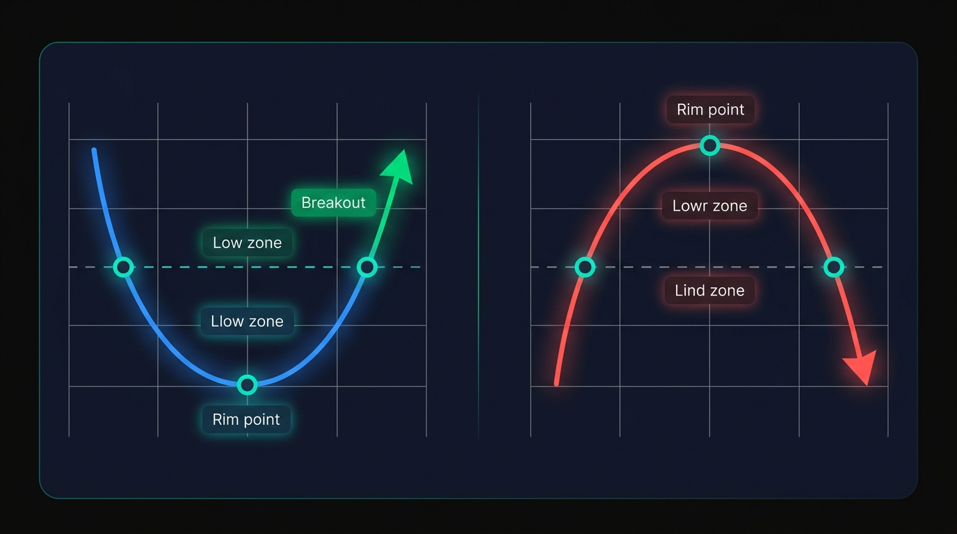 - A handle that drops below the cup's midpoint → suggests sellers still have meaningful control; this reduces breakout probability and should be treated as an invalidating signal