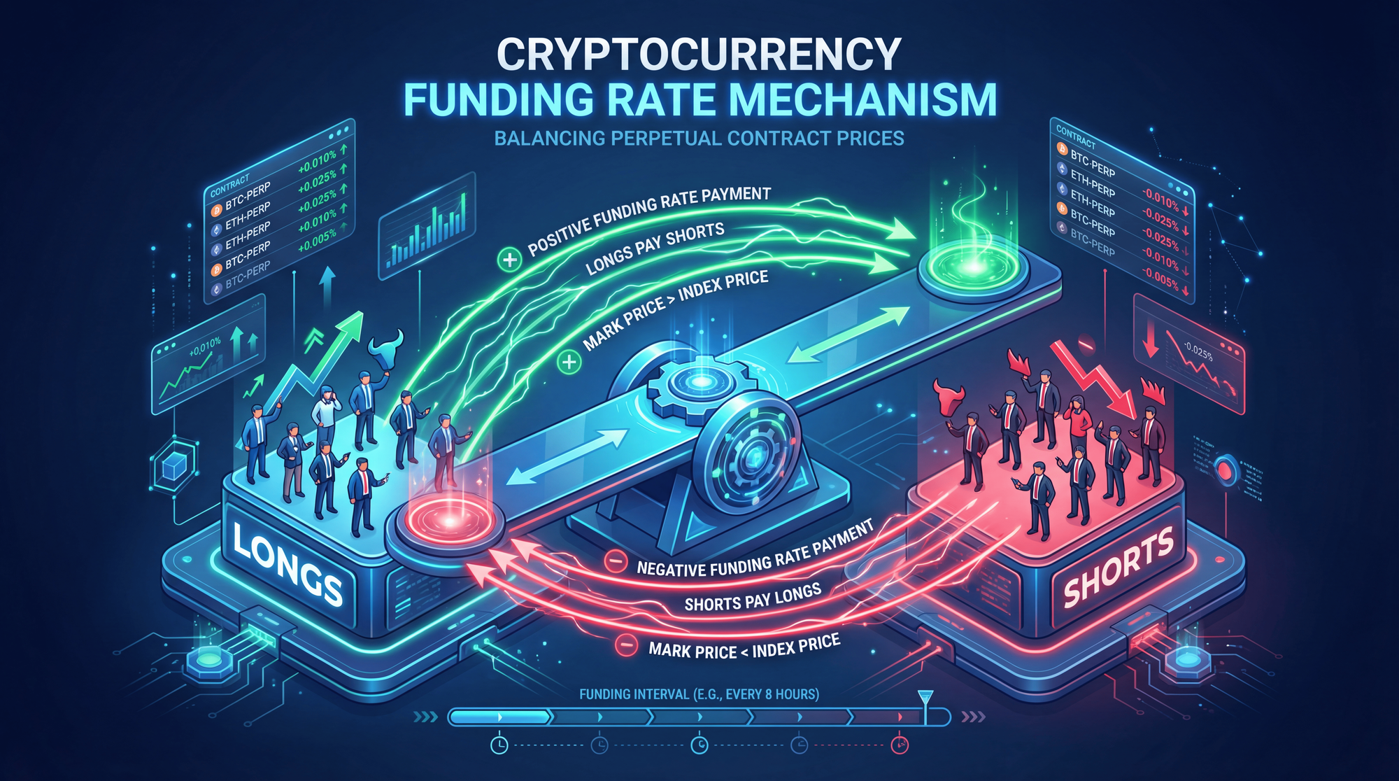 Think of it this way: if too many traders bet on prices going up (long positions), the perpetual contract price rises above the spot price. The funding rate mechanism corrects this by charging longs and paying shorts, incentivizing balance.