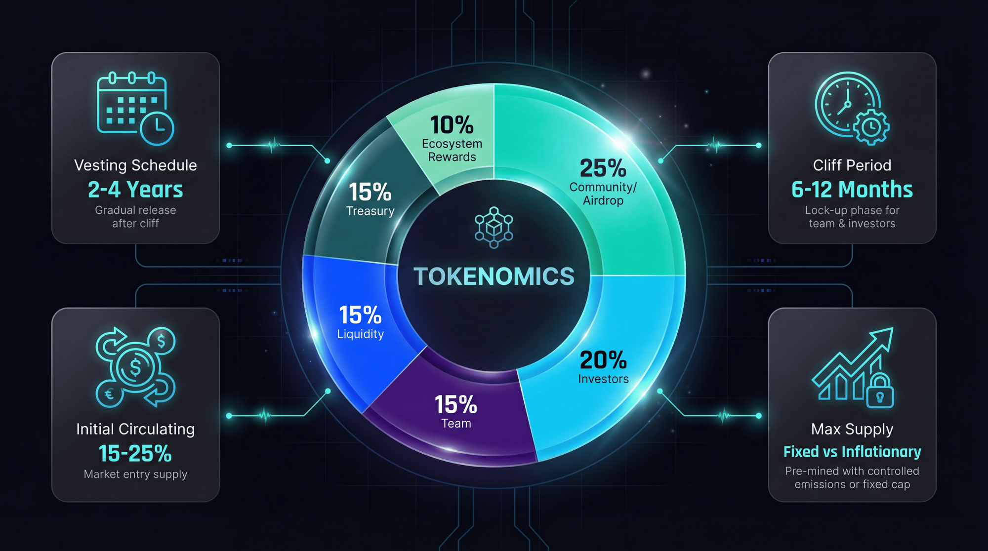 Key tokenomics components you must define include total supply which determines scarcity and should align with your use case, distribution split across team, investors, community, treasury, and liquidity, vesting schedules with 2-4 year vesting with 6-12 month cliff being standard for team tokens, utility mechanisms explaining how tokens are used, earned, and potentially burned, and inflation/deflation deciding whether supply is fixed, inflationary, or deflationary through burns.