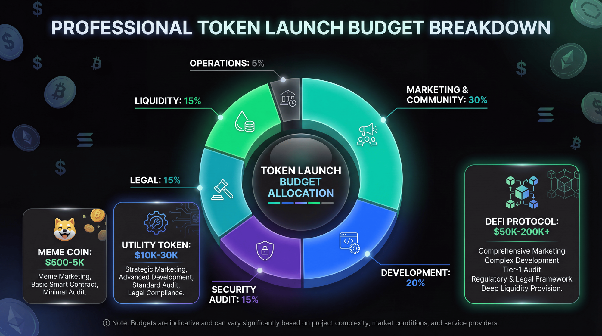The budget breakdown typically includes smart contract development at 15-25% of total budget, security audit at 10-20%, legal and compliance at 15-25%, marketing and community at 25-35%, liquidity provision at 15-25%, and operational costs and contingency at 10-15%.