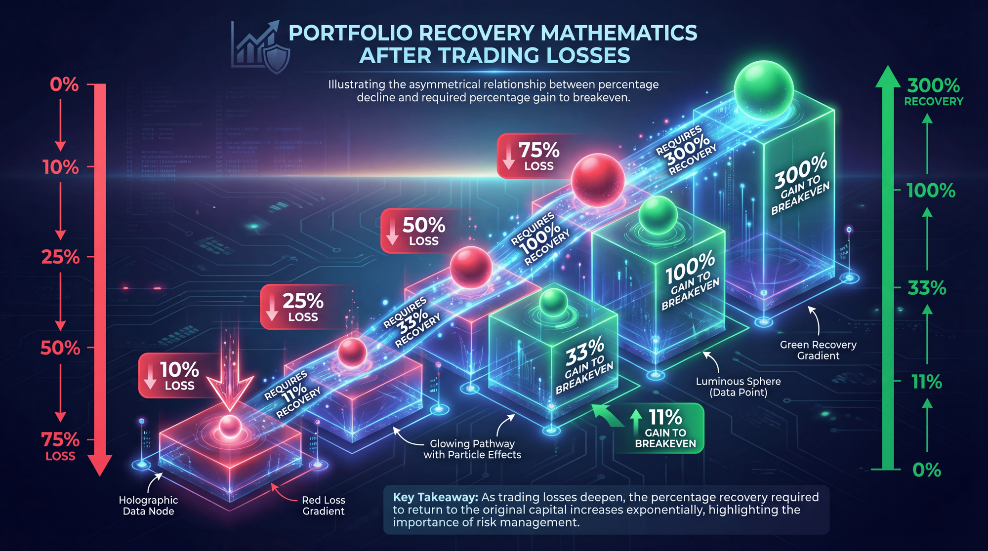 The mathematics of drawdowns also demands attention. A 50% loss requires a 100% gain just to break even. A 75% drawdown needs a 300% recovery. The deeper you fall, the steeper the climb back becomes. Risk management prevents these holes from forming in the first place.