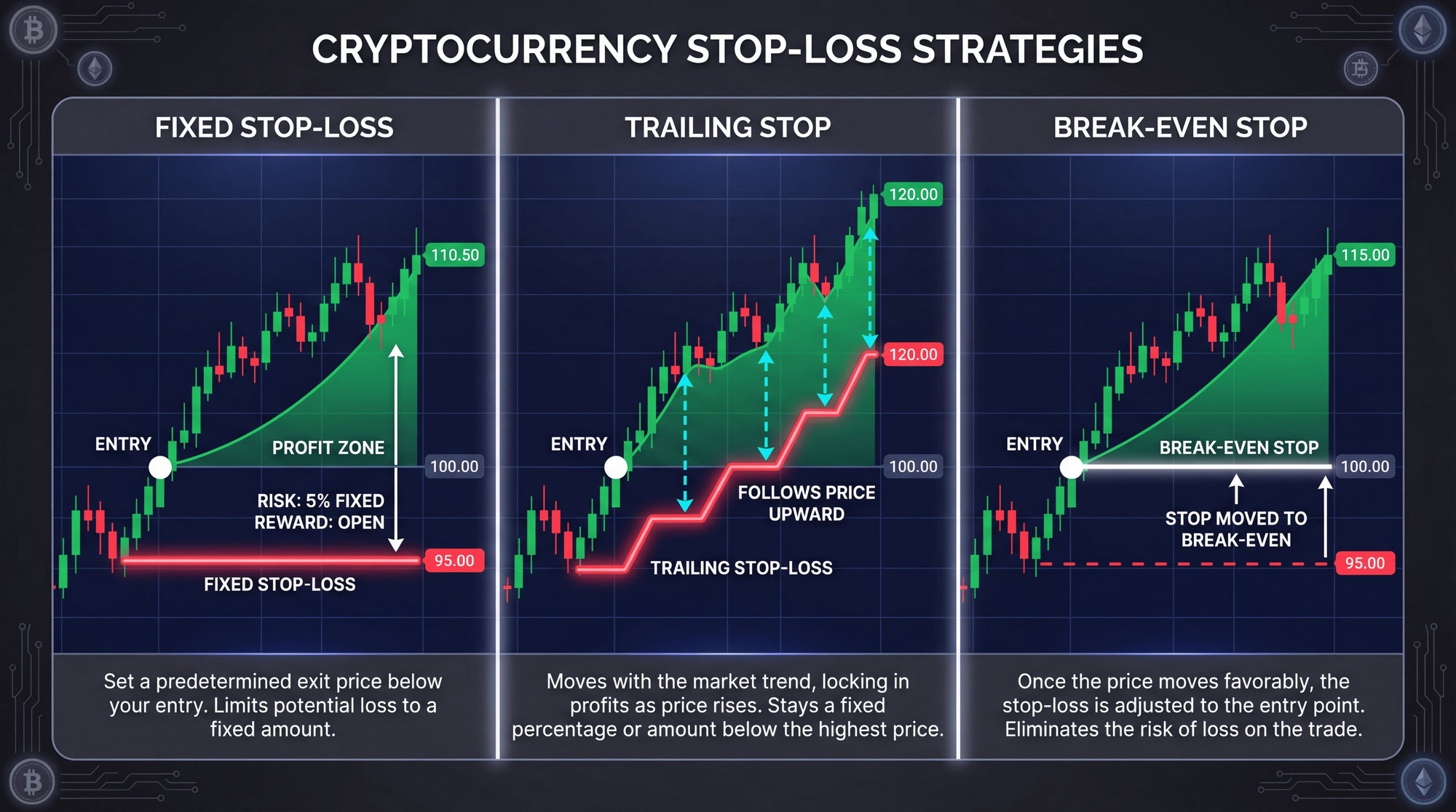 Fixed Stop-Loss: Set at a specific price point below your entry. If you buy Ethereum at $4,000 and place a stop at $3,800, your position closes automatically if price drops to that level, limiting your loss to 5%.
