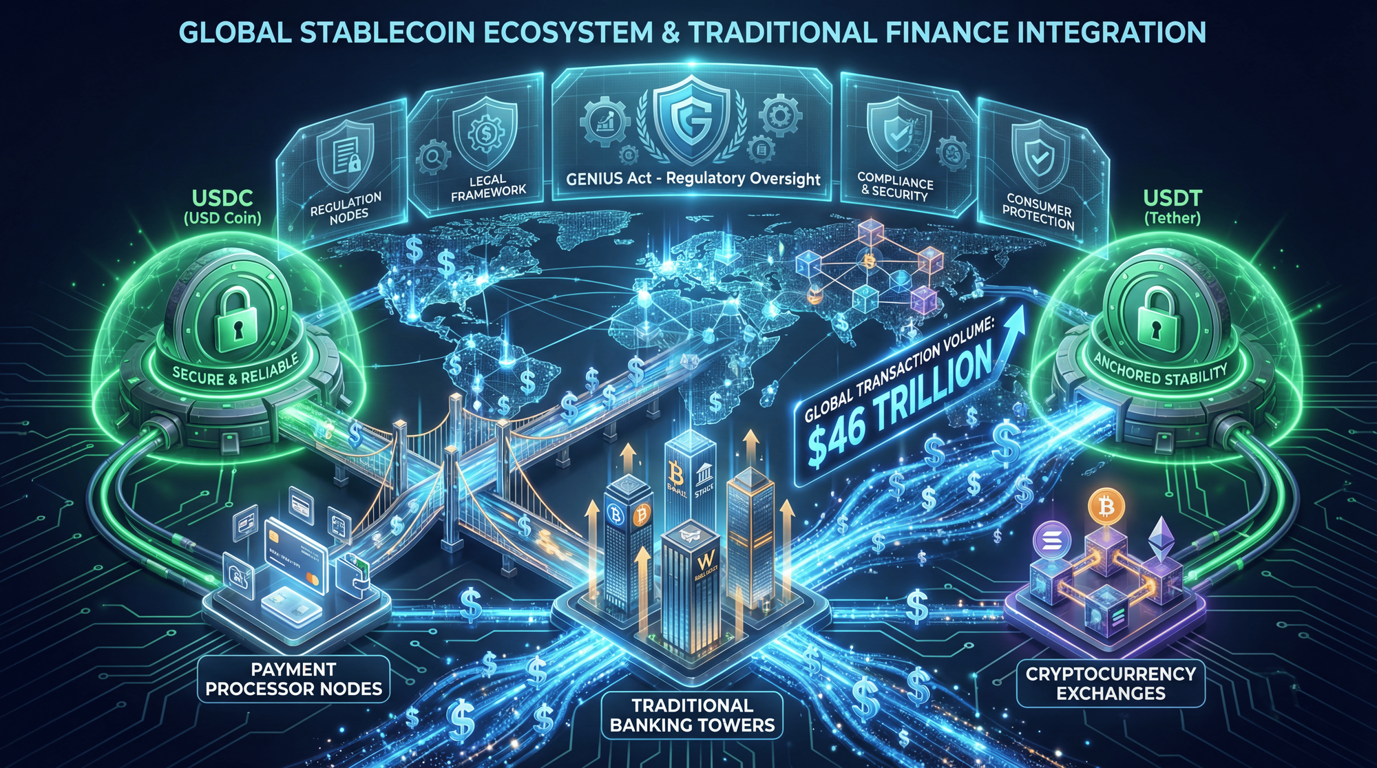 - Stablecoin Adoption: $46T transaction volume, projected $1T circulation by late 2026