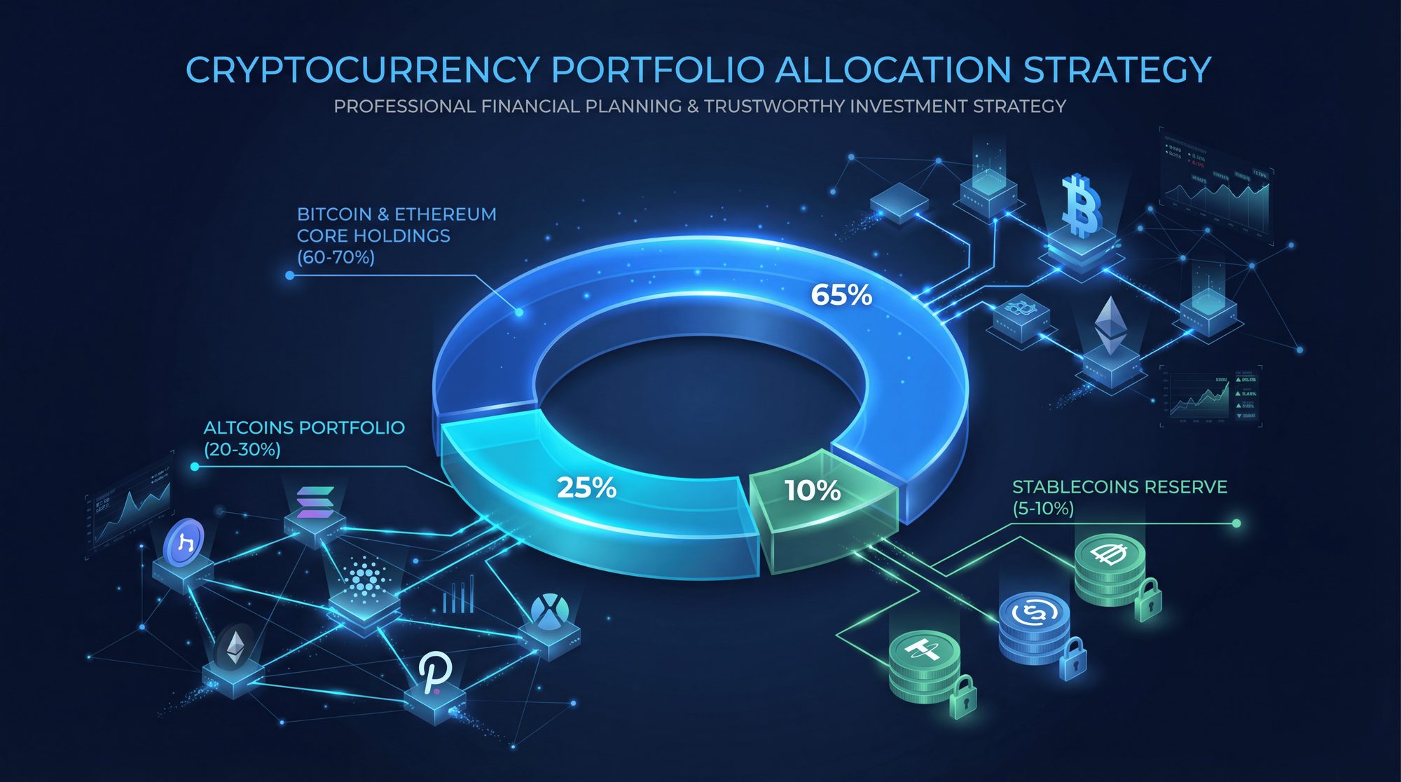 - 60-70% Core Holdings (BTC + ETH): The foundation of your portfolio-maximum liquidity, institutional adoption, and proven resilience