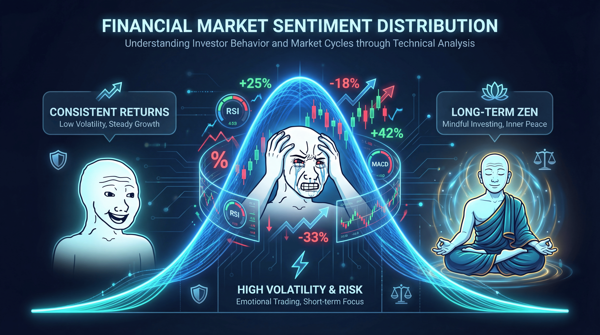 The joke centers on the IQ bell curve format, where three groups are represented. The left side shows a "simple" thinker who just buys Bitcoin and holds. The middle - the "midwit" - obsesses over RSI indicators, Fibonacci retracements, head-and-shoulders patterns, and elaborate trading setups. The right side depicts a wise figure who also simply buys and holds, arriving at the same conclusion as the "simple" thinker through deeper understanding.