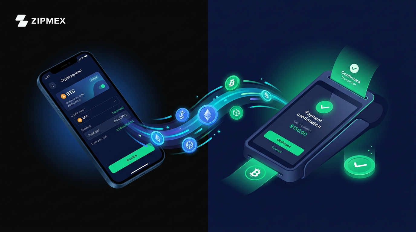 - Merchant receives payment in stablecoin or fiat, with no exposure to crypto price movement