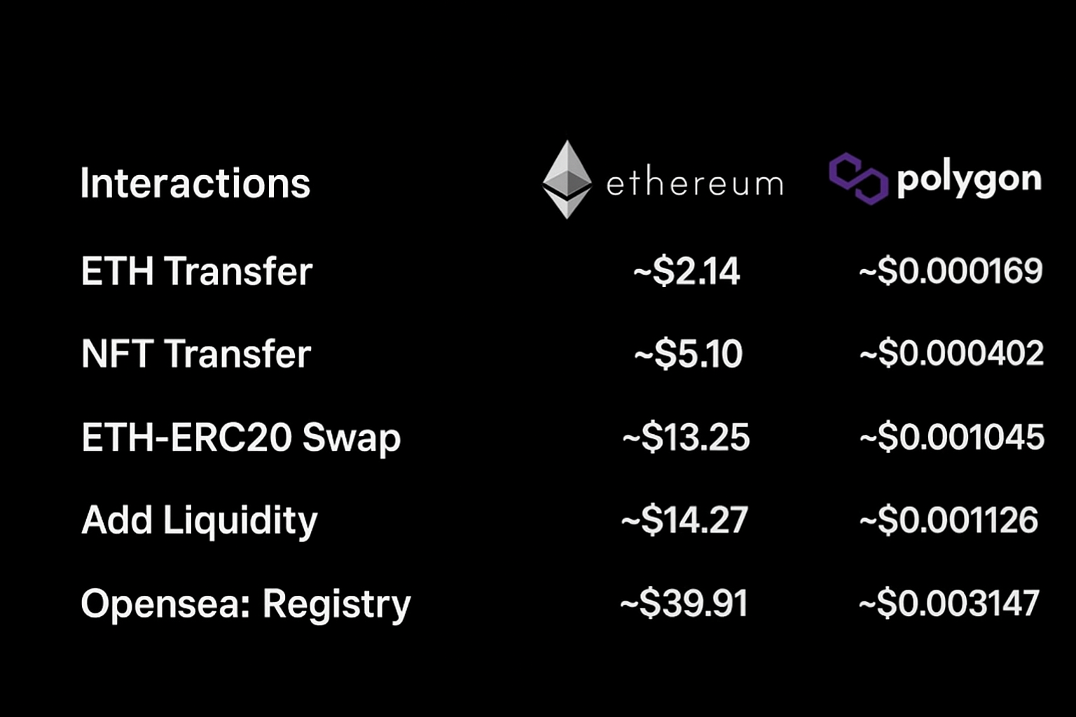 The standard gas fee of Polygon is extremely cheap, being less than US$0.01 per transaction. Ethereum, on the other hand, has a standard gas fee that usually starts at US$25, and that value is constantly changing and going up depending on the network congestion.