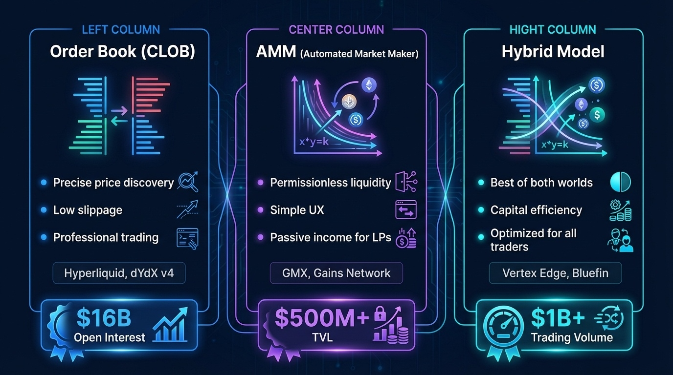 - Order book vs. AMM architecture - Hybrid models like Hyperliquid's central limit order book (CLOB) offer better capital efficiency