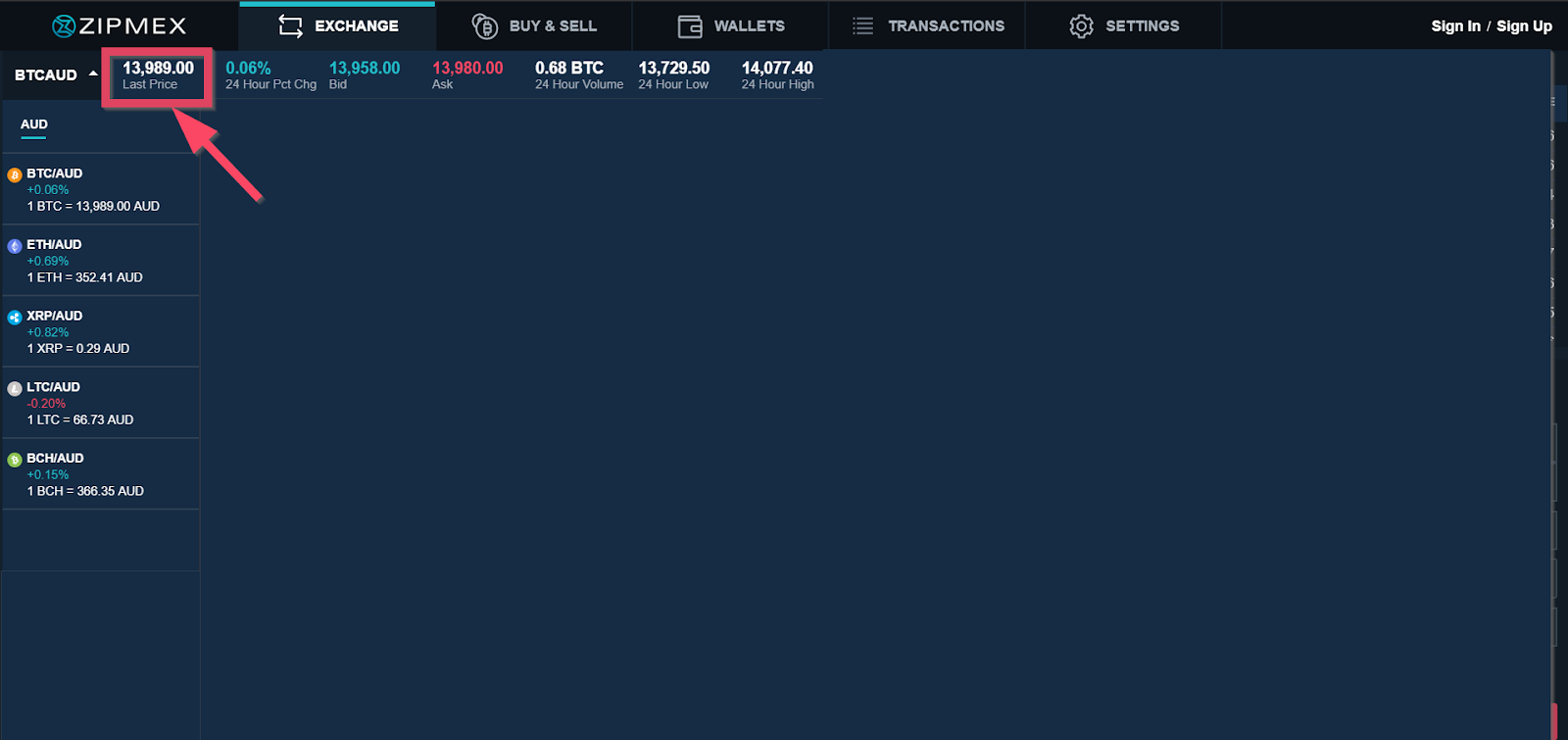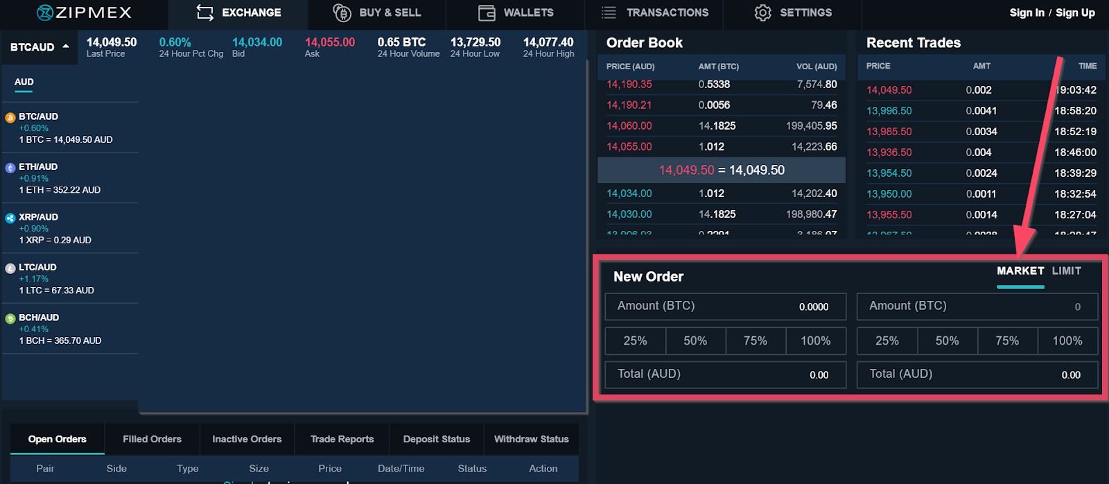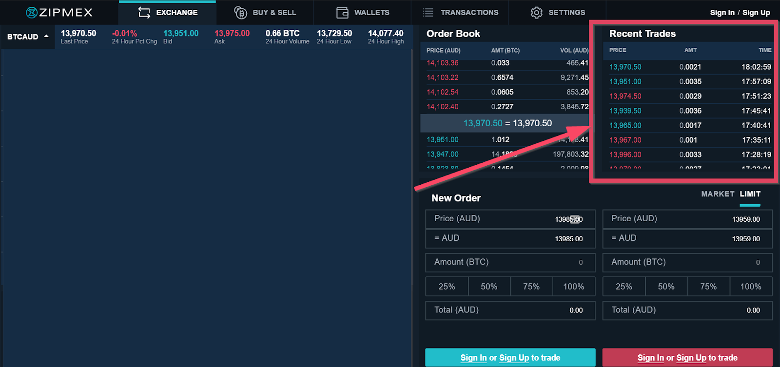 In the screenshot below, you can see that the most recent transaction for BTC/AUD was at 18.02 hrs for 0.0021 BTC at 13,970.5 AUD.