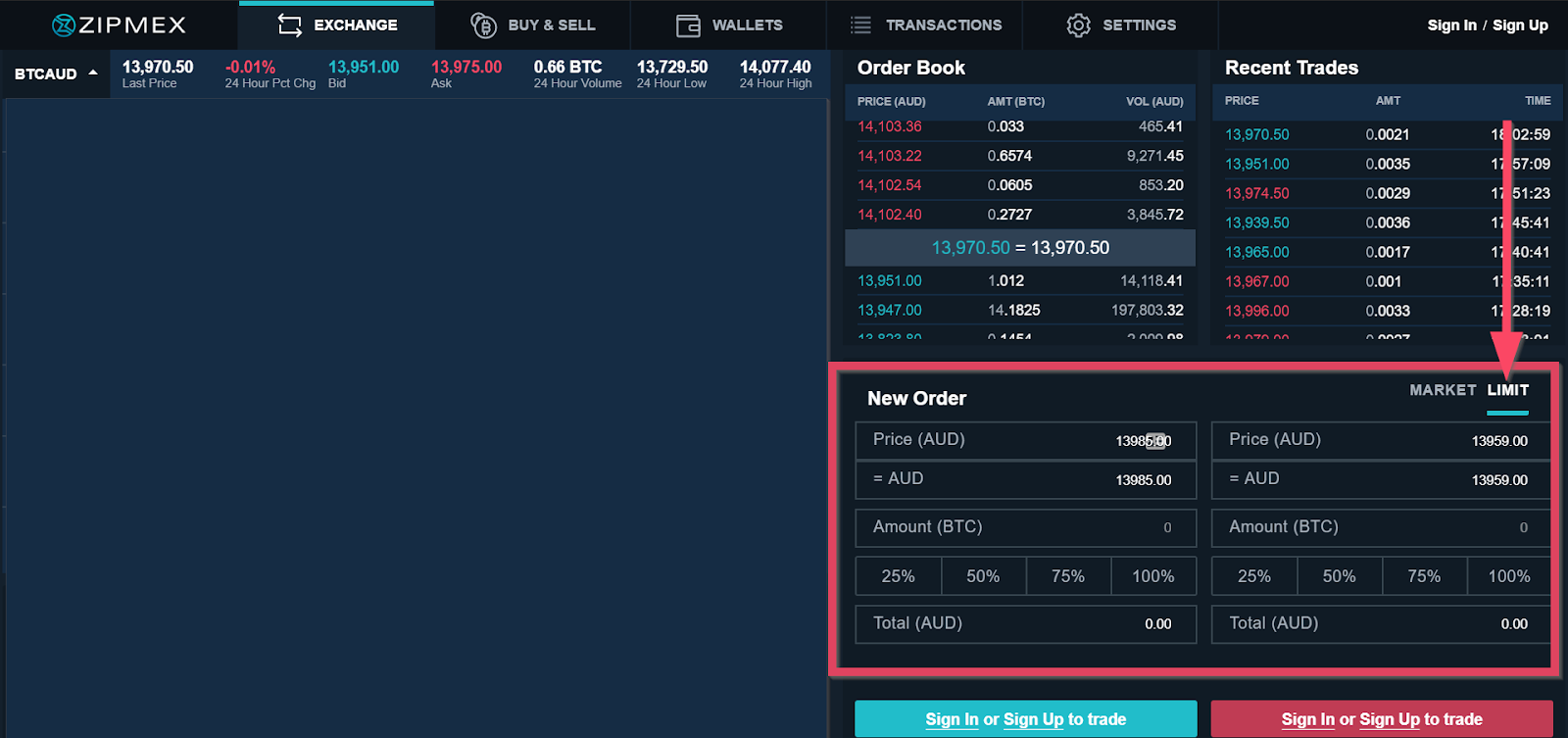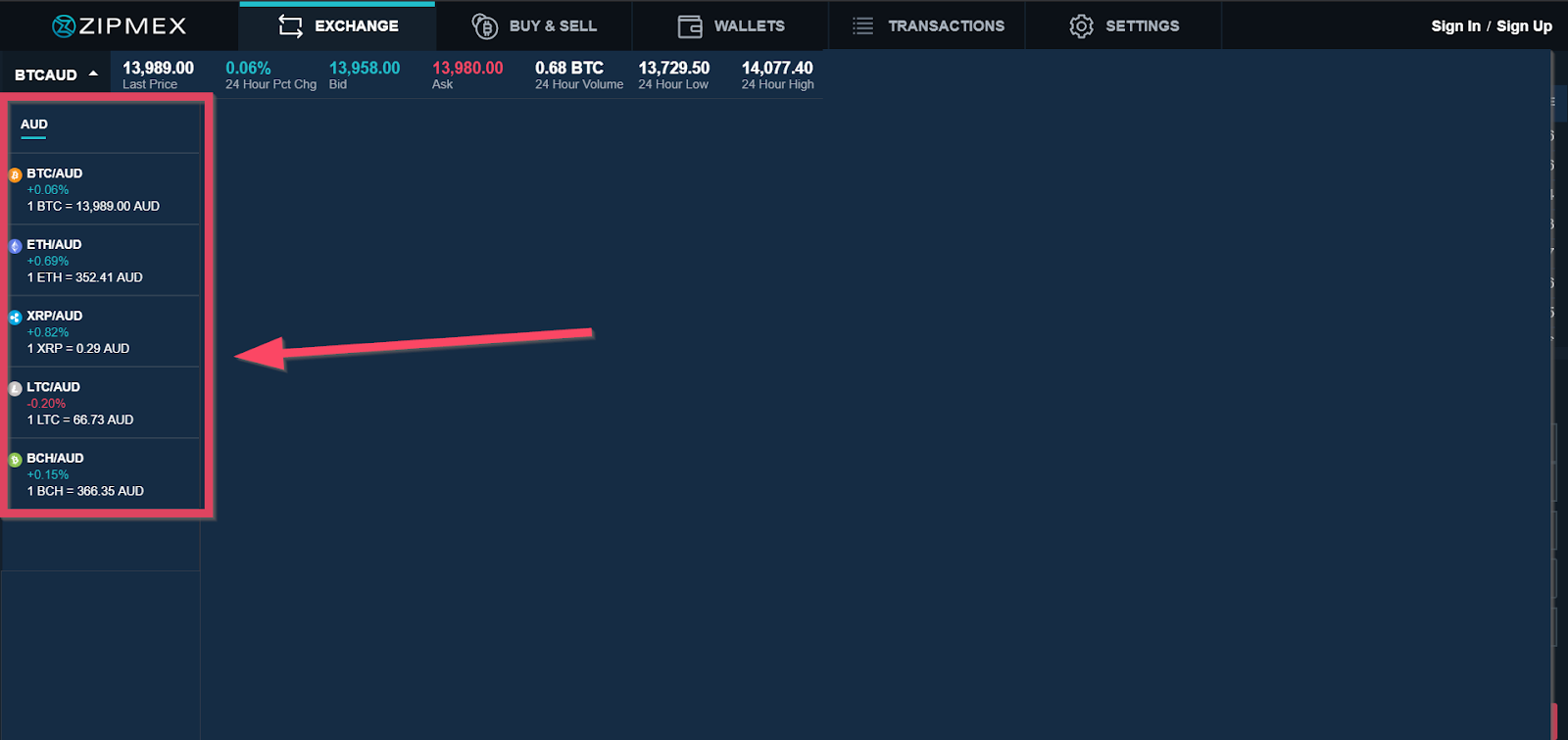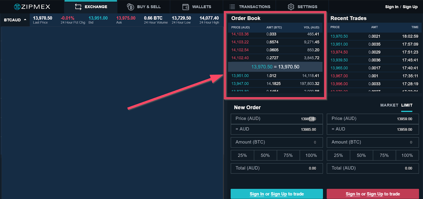 In the screenshot below, you can see that the most recent transaction for BTC/AUD was at 18.02 hrs for 0.0021 BTC at 13,970.5 AUD.