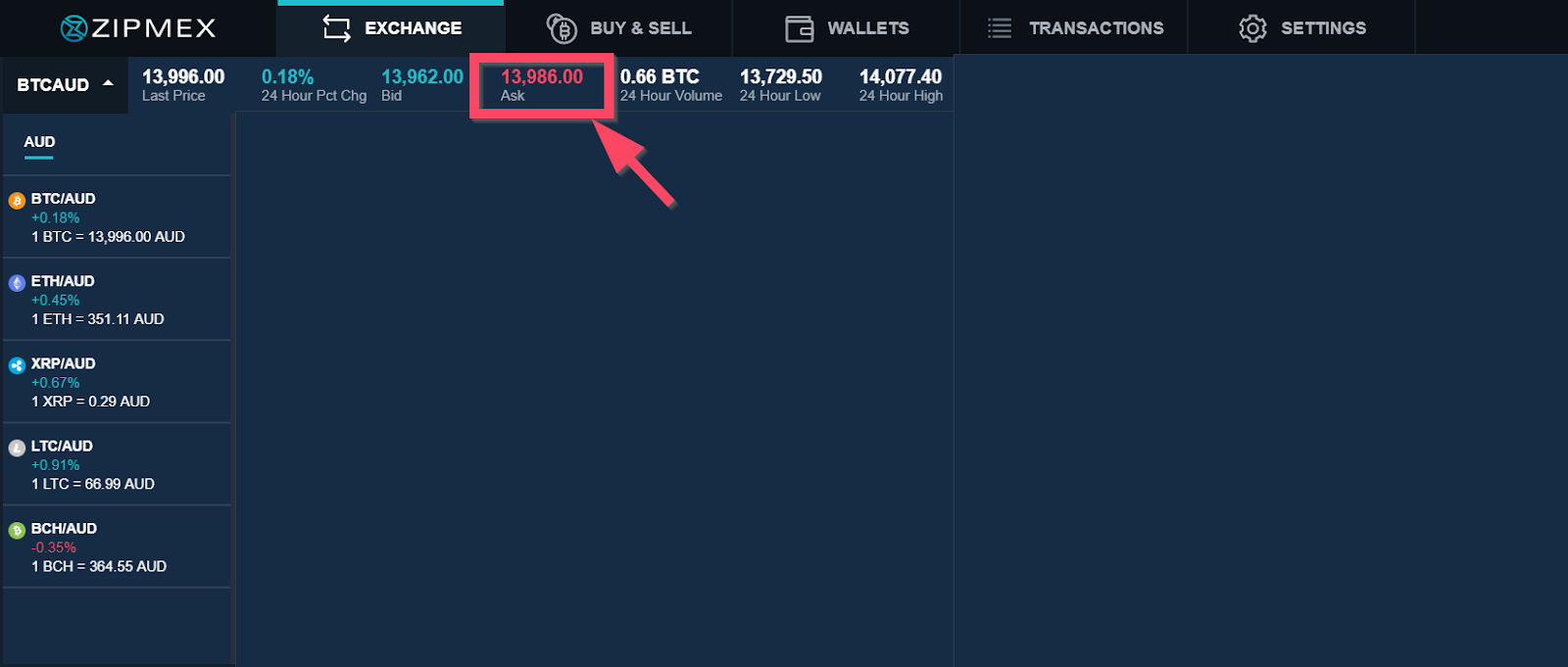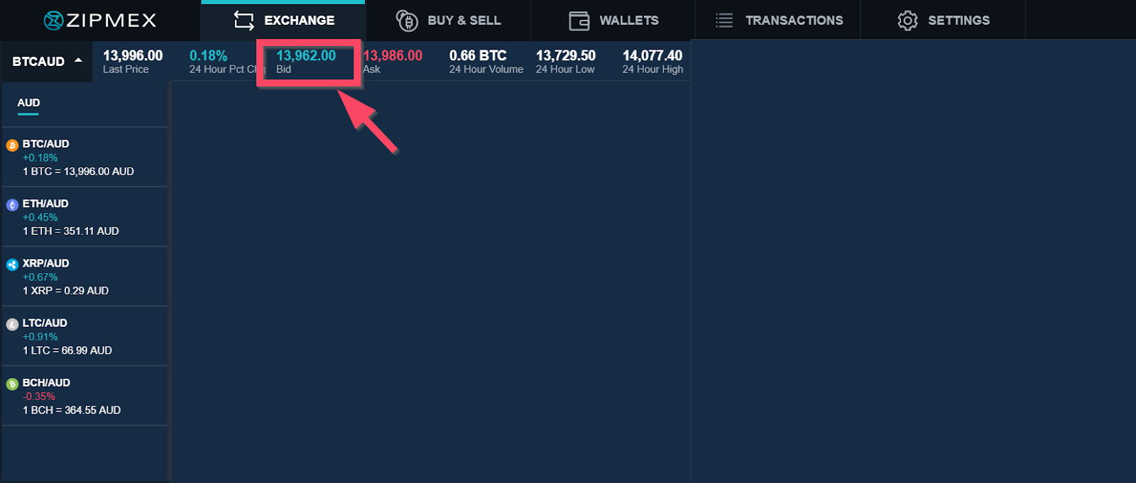 In the sample below, you can see the Bid is 13,962 for BTC/AUD paring, which means the current highest price that buyers are willing to pay for 1 Bitcoin is 13,962 AUD.