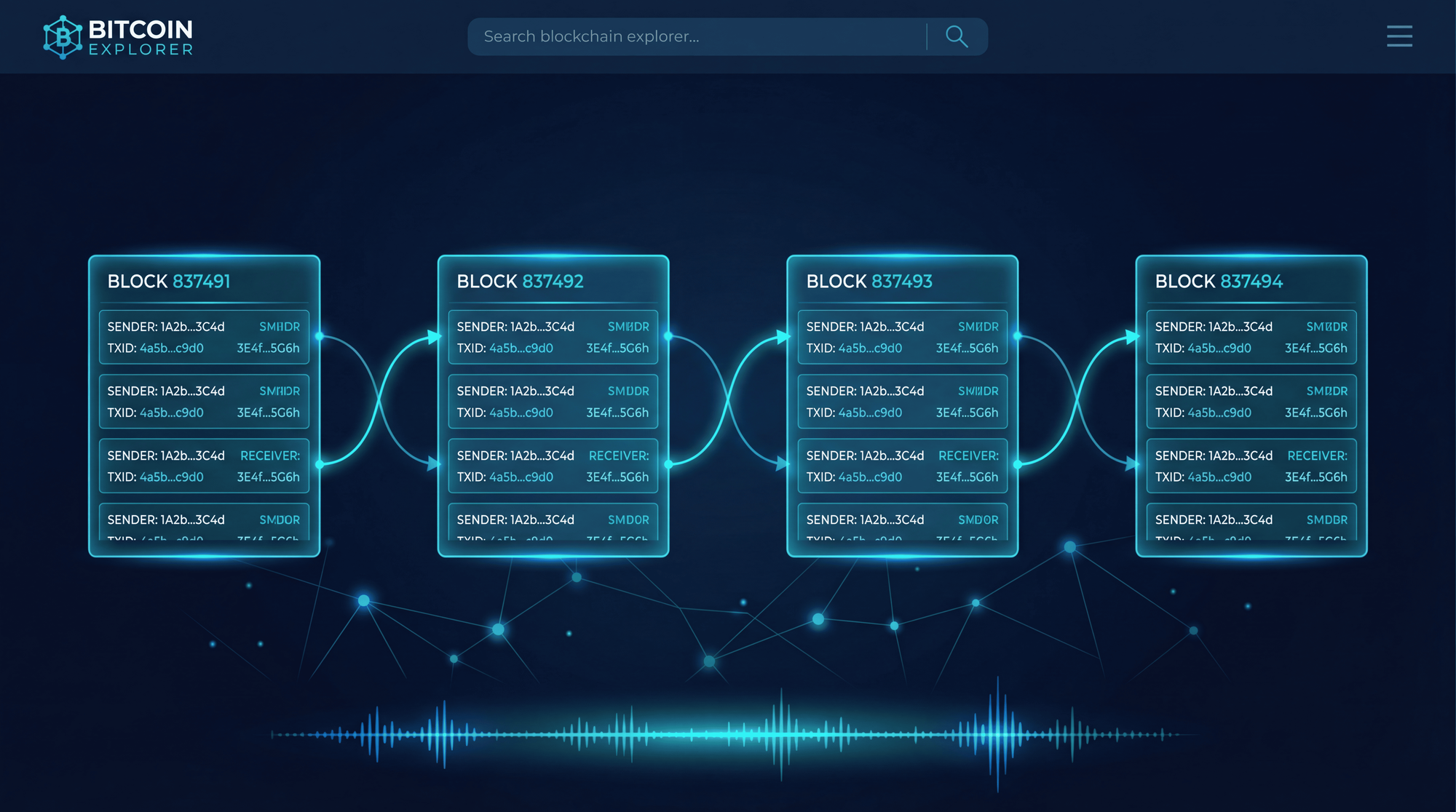 Transaction view: Every Bitcoin transfer shows a transaction hash (a long string like '3a1b2c3d4e5f...'), the sender's address, the receiver's address, the amount transferred, and the fee paid.