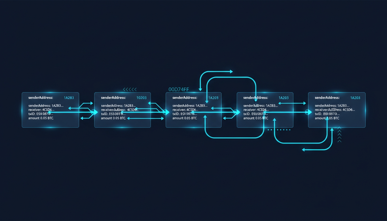 Transaction view: Every Bitcoin transfer shows a transaction hash (a long string like '3a1b2c3d4e5f...'), the sender's address, the receiver's address, the amount transferred, and the fee paid.