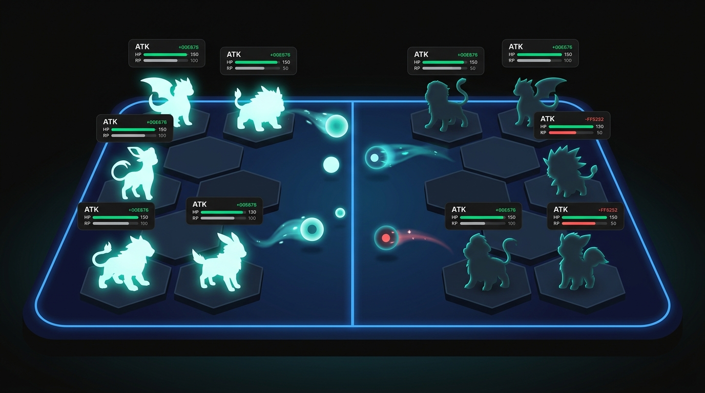 Before your first battle, you pick a team. Binemon's combat system is turn-based - players arrange five Mons into a formation before entering a match, and combat is time-limited, proceeding in a defined order with specific targets each turn. The formation you choose matters: placing a tank in front to absorb hits while a mage deals damage from the back row is basic strategy, but high-level PvP requires deeper positioning decisions.