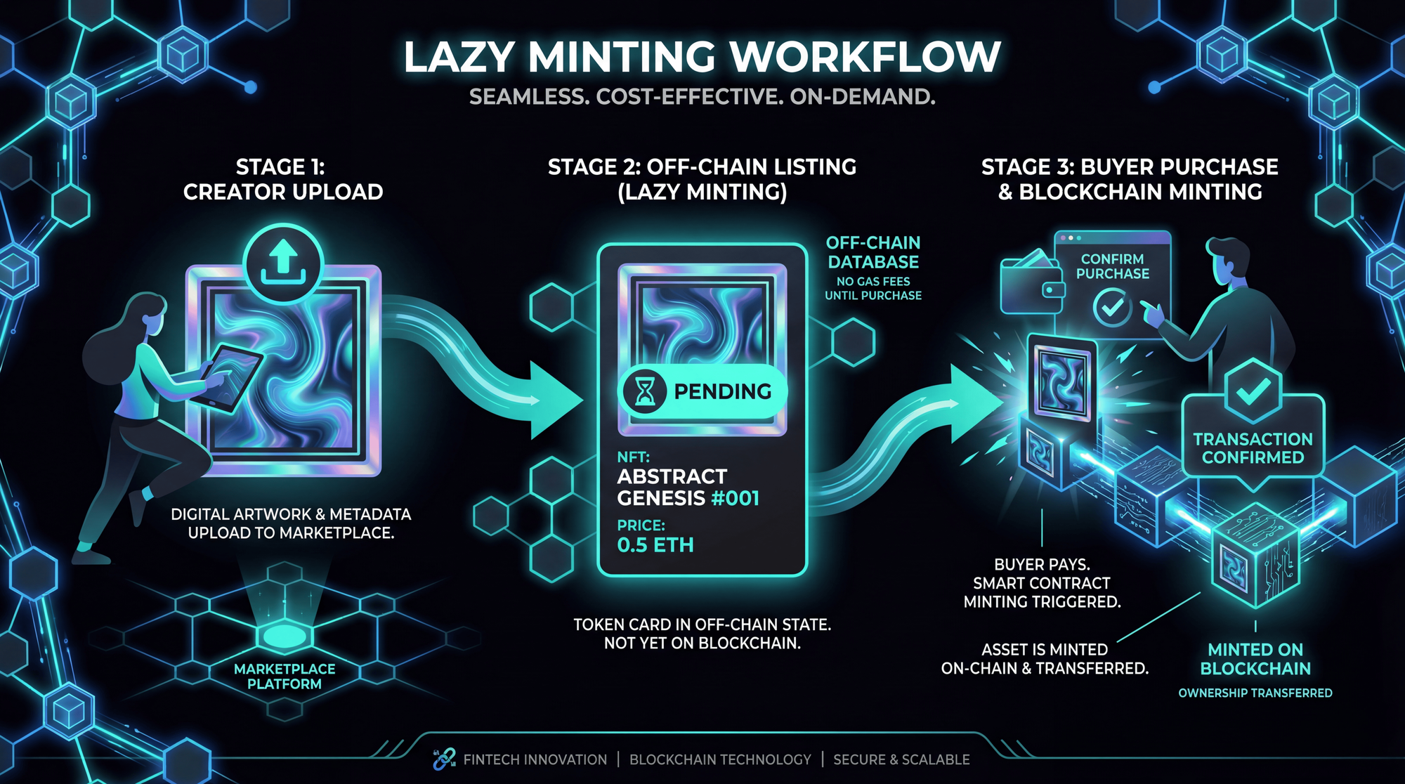 Lazy minting is a revolutionary approach that solves one of the biggest barriers in the NFT space: upfront gas fees. Instead of paying to record your NFT on the blockchain immediately, your artwork exists "off-chain" until someone purchases it.