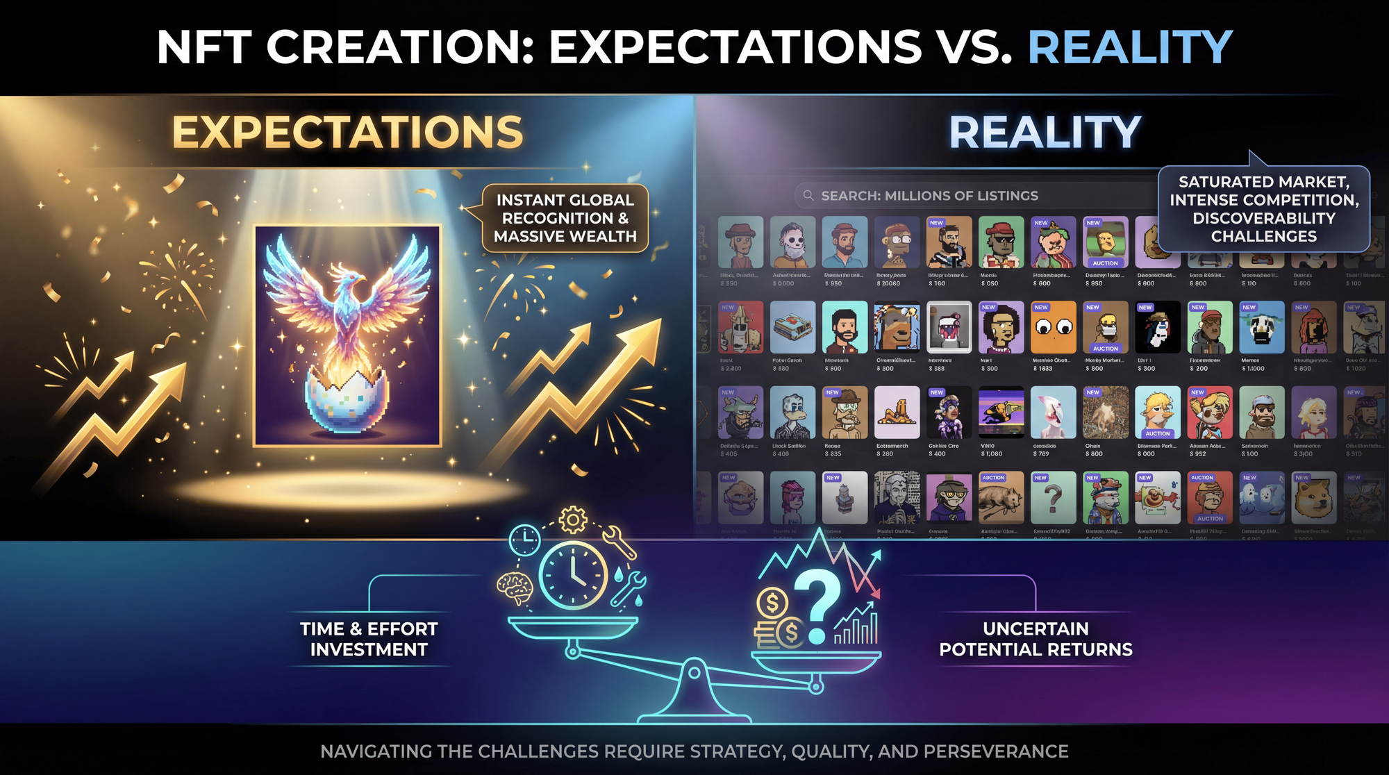 The NFT market has changed significantly since 2021-2022. Trading volumes are down 90%+ from peak levels. Most NFTs created today never sell. Free minting eliminates financial risk, but invest your time wisely and have realistic expectations.