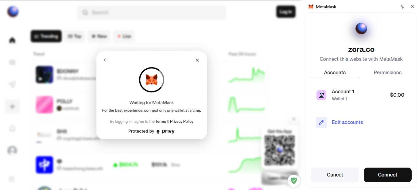 Visit zora.co and click "Connect" in the top right corner. Select MetaMask (or your preferred wallet) and approve the connection. Your wallet is now linked to Zora - no registration forms or email required.