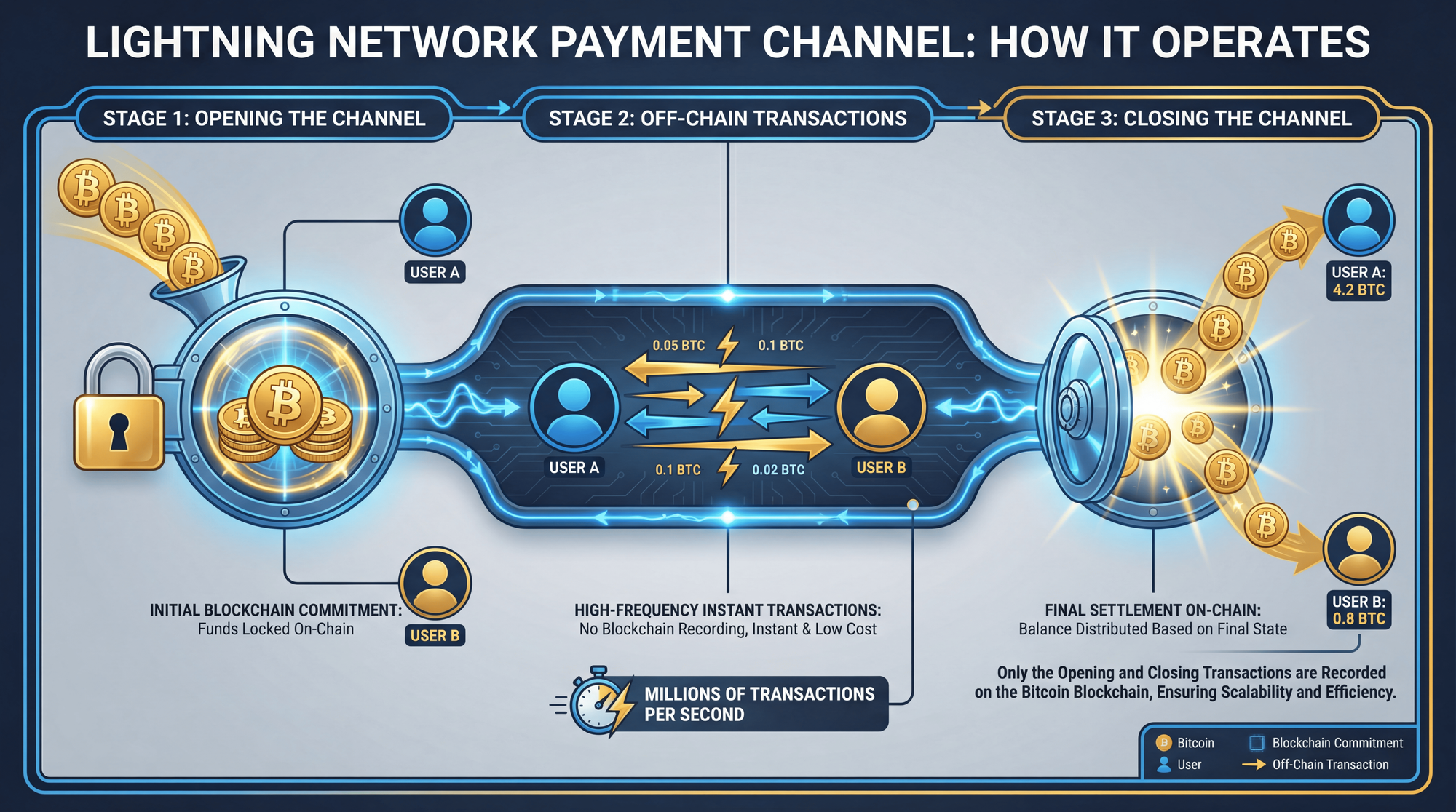 Think of it like a bar tab. You open a tab (payment channel), order multiple drinks throughout the night (Lightning transactions), and settle the entire bill at the end (closing the channel). Only two transactions hit the main blockchain: opening and closing the tab.