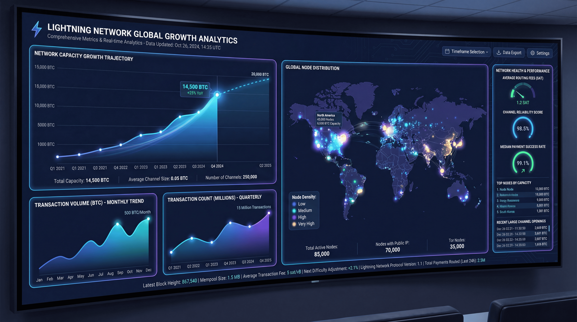 The network reached an all-time high in capacity in late 2025, with major exchanges like Binance and OKX significantly increasing their Lightning liquidity. Public Lightning volume surged 266% year-over-year, though transaction counts declined-indicating a shift toward higher-value enterprise payments.